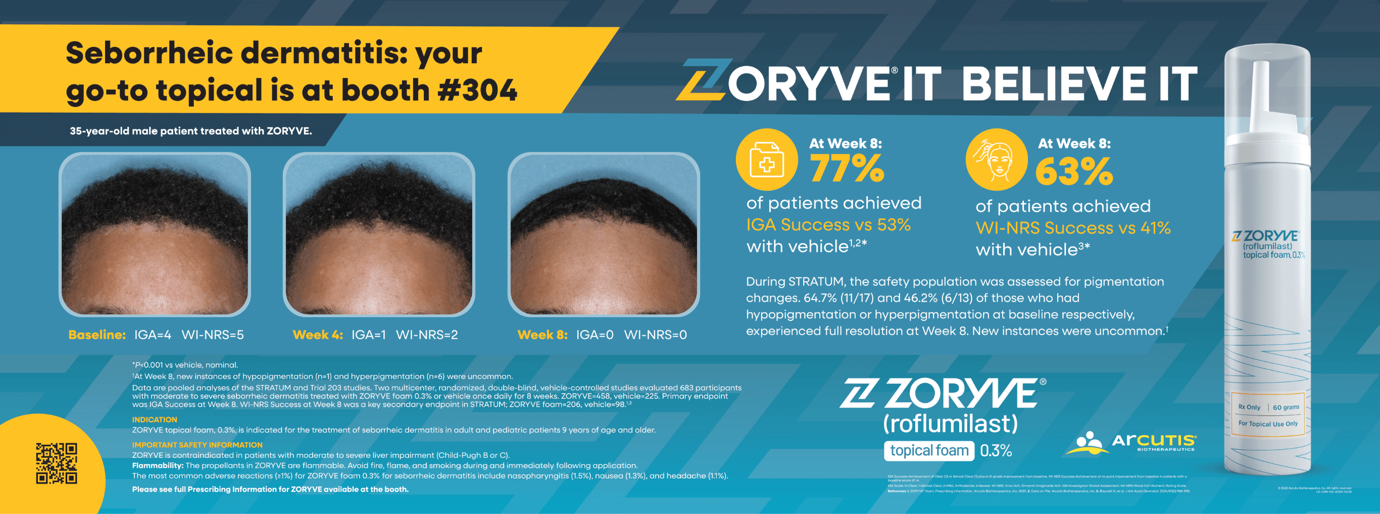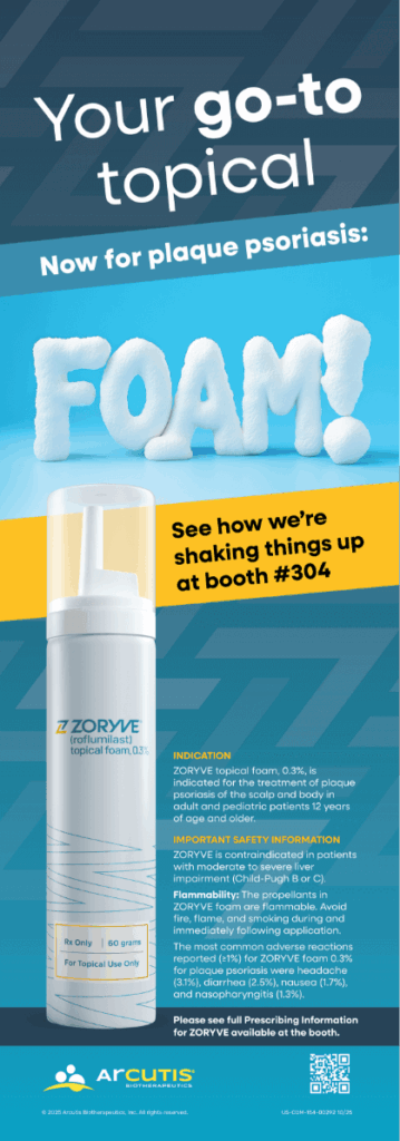 At congress, the foam came to life in three dimensions. A looping video seamlessly blended before-and-after imagery with clinical data, creating a dynamic, visual proof of ZORYVE’s impact. Aspirational imagery of diverse users showed how foam fits effortlessly into real skin, real tones, and real lives — bringing the brand’s promise of simple, adaptable care to life.